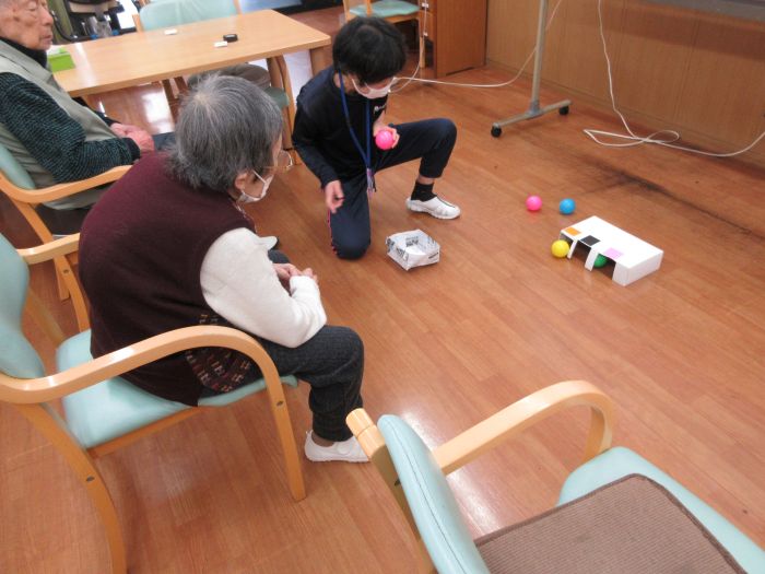 5個のボールを箱の穴に入れていく簡単なゲームです。実際やってみると、ボールが曲がったり箱に当たって入らなかったりと意外と難しい!!
