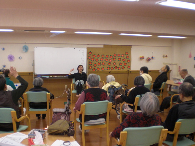 節分に豆まきをおこないました。「鬼はそと・福はうち」の掛け声と共に、鬼に扮した職員にむかって、皆様元気よく豆をまいてくださいました。豆まきのあとは鬼と一緒に記念撮影をおこないました。皆様の素敵な笑顔がみられました。