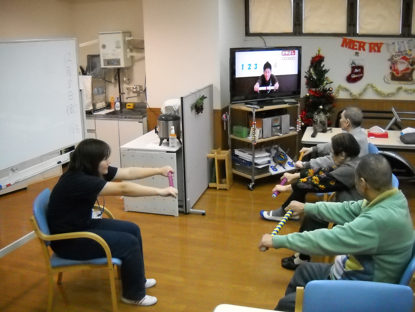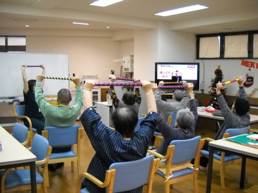 タオル体操を皆様と一緒に行いました。椅子に座ったままタオルを持って首・肩・腕・腰などのストレッチ運動を「イチ・ニイ・サン」と声を出しながら行いました。ご利用者様からは「とても身体が温まった」「簡単だから家に帰ってやってみる」などのお言葉をいただきました。