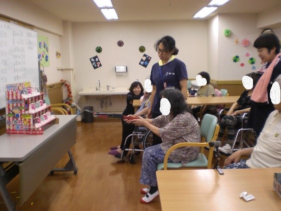 毎月利用者様と一緒に季節のカレンダーを作っています。切るのが好きな方、折るのが好きな方などそれぞれ分かれて担当して行ってもらっています。
