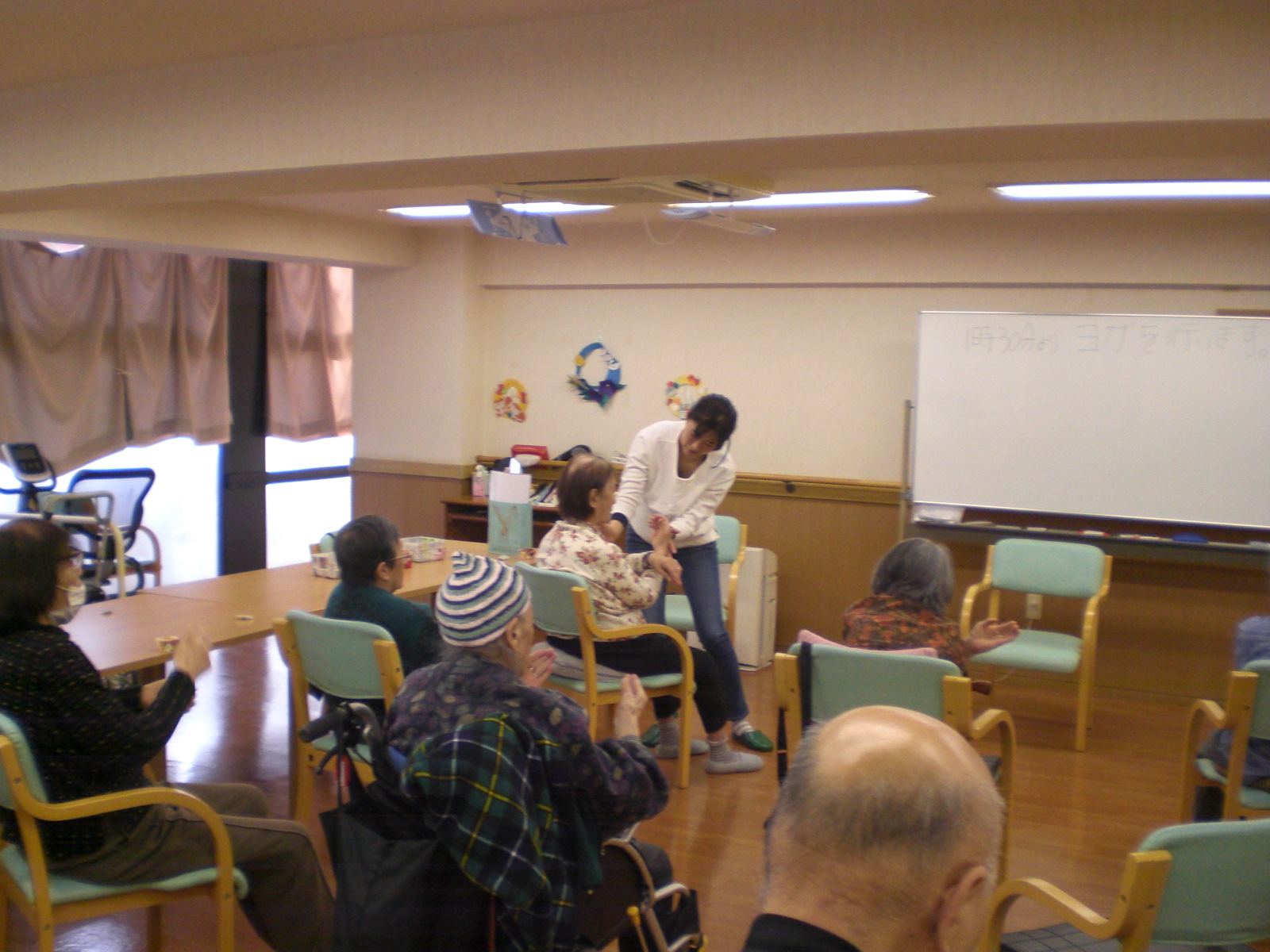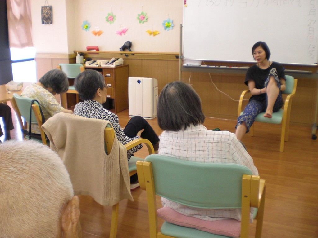 インストラクターの先生を招いてヨガをおこないました。座ったまま簡単に行える内容になっており、呼吸法を取り入れながら様々なポーズにチャレンジしていただきました。皆様からは「日頃動かさないところを動かせてよかった」「リフレッシュできた」などのお言葉をいただきました。